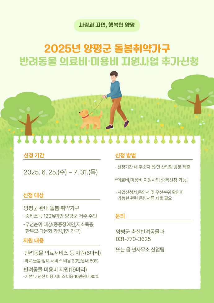 양평군은 반려동물을 양육하는 사회경제적 취약가구의 부담을 덜기 위해 ‘반려동물 의료 서비스 및 미용비 지원 사업’의 추가 신청을 7월 31일까지 받는다.